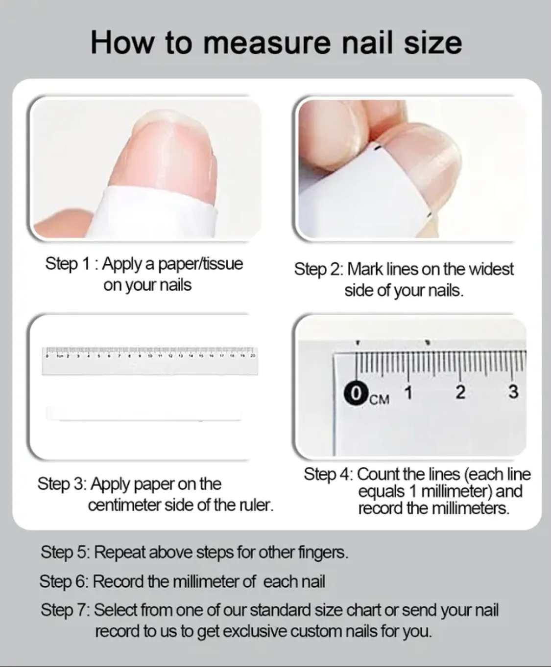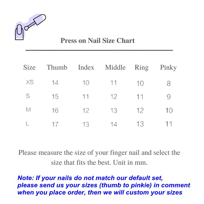 Please follow below steps. Not every seller uses the same nail measuring guide or nails. Please be sure to measure your nails accurately.