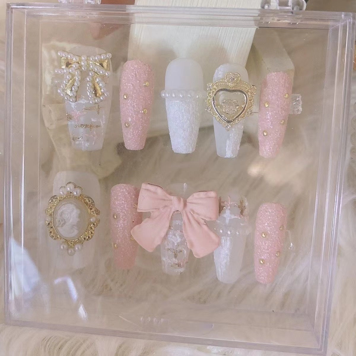 All nail orders come with 10 pcs of handmade press ons, 24pcs of sticker pads, 1 nail glue, 1 wood stick, 1 nail file, 1 alcohol prep pad.