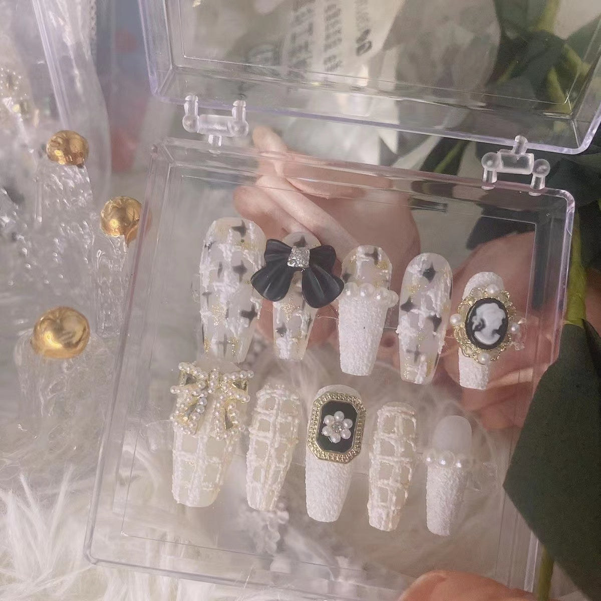 All nail orders come with 10 pcs of handmade press ons, 24pcs of sticker pads, 1 nail glue, 1 wood stick, 1 nail file, 1 alcohol prep pad.