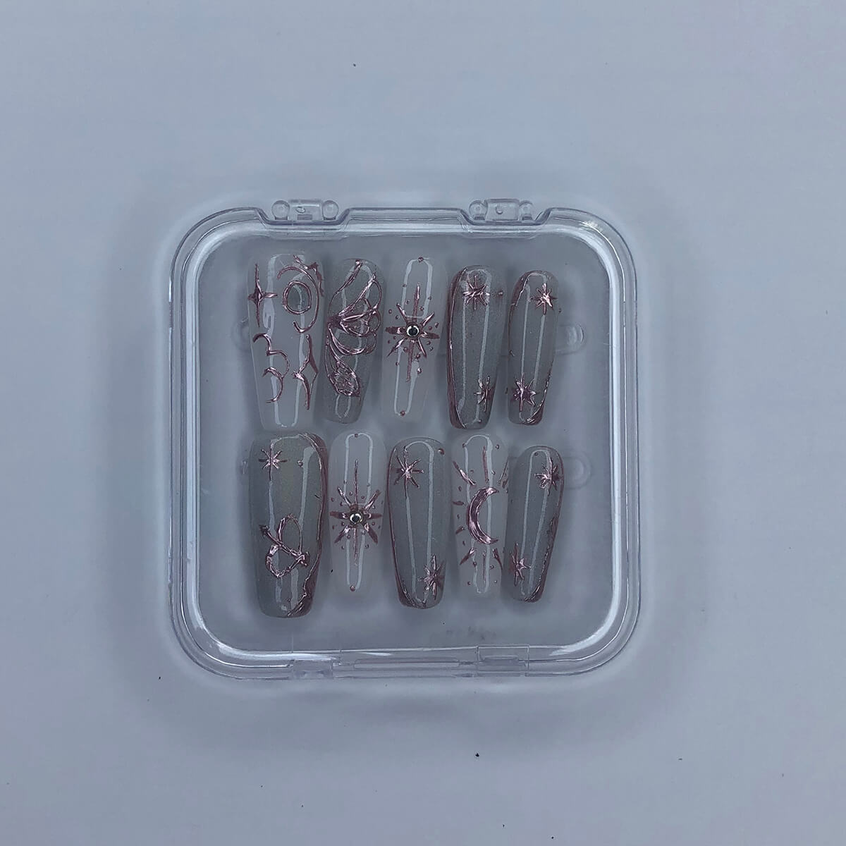All nail orders come with 10 pcs of handmade press ons, 24pcs of sticker pads, 1 nail glue, 1 wood stick, 1 nail file, 1 alcohol prep pad.