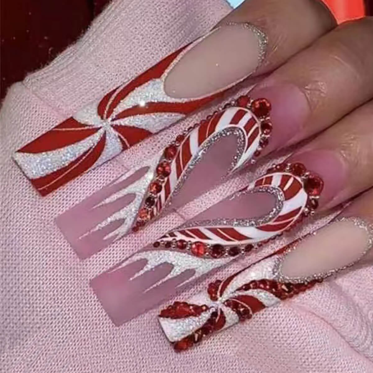 Red Starburst Square Red Rhinestone French Nails